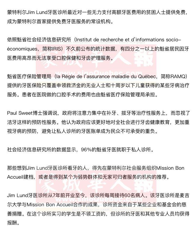 到麦吉尔大学(Université McGill)Jim Lund牙医诊所看牙的病人常常都饱受牙痛之苦。他们中有一部分人是拖了太久才去看牙医,以至于牙齿问题影响到了整个身体健康。Jim Lund牙医诊所目前只提供检查、洁牙、补牙和拔牙之类的基础服务,不能为需要更多干预(比如说根管治疗或安装牙套)的病人做进一步治疗。 Jim Lund诊所的牙医Paul Sweet博士指出,该诊所接待的病人通常是一些无法在其他地方获得牙科护理的贫困人士,牙齿的问题可能让他们的心脏、肺和牙龈也受到影响,亦或是产生自卑心理。 据Paul Sweet博士观察,有很多到Jim Lund诊所就医的病人不了解口腔健康的重要性,他们从小时候开始就没有好好刷牙,有了很多蛀牙和严重的牙病之后又对看牙医感到羞耻或惧怕,从而形成一个难解的恶性循环。Jim Lund诊所的前台秘书Carole说,有些人在看牙这个问题上一拖再拖,最后把可以轻松修复的蛀牙拖成了需要被连根拔除的烂牙。 |
