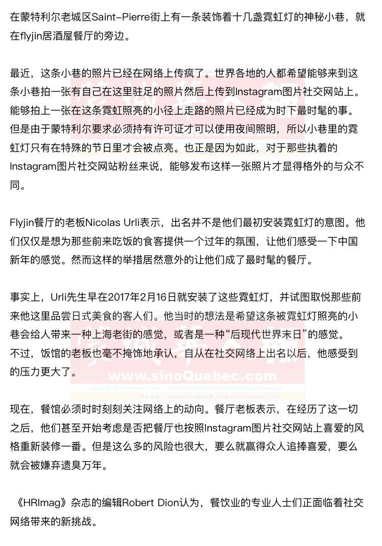 这位餐饮和酒店行业的专家表示,当他和餐馆老板们交谈时发现,如今的餐饮业老板们每天早晨起来的第一件事居然是去互联网上查看他们的餐厅形象和客人对他们的评论。尤其是像TripAdvisor这样的知名网站上的客户评论,对餐馆的营业额的影响是巨大的。给餐馆老板带来的压力也是巨大的。 如果客人想要在蒙特利尔城区的公共街道上看到马路被霓虹灯照亮的景象,那恐怕要等到失去耐心。 Nicolas Urli解释说,如果想在公共街道上点亮霓虹灯,至少需要获得来自蒙特利尔市政府和周围建筑物业主们的许可。虽然他们在小巷里安装的只是零星不多的霓虹灯,但是申请许可的步骤仍然不可忽略。酒馆老板已经知道人们期待看到霓虹灯被点亮的心情, 但是他必须要求大家继续保持耐心。 许多以前从未来过Flyjin就餐的新客人已经向餐厅打电话询问,还有不少人发来了电子邮件。他们都想知道餐厅何时还会把霓虹灯安装起来。有了之前成功的经验,Urli先生现任也希望Saint-Pierre街417号可以重新在蒙特利尔老城被点亮。他计划在今年夏天的F1大赛期间重新安装并点亮霓虹灯。现在,不少网络用户已经向他预约了位置。 |