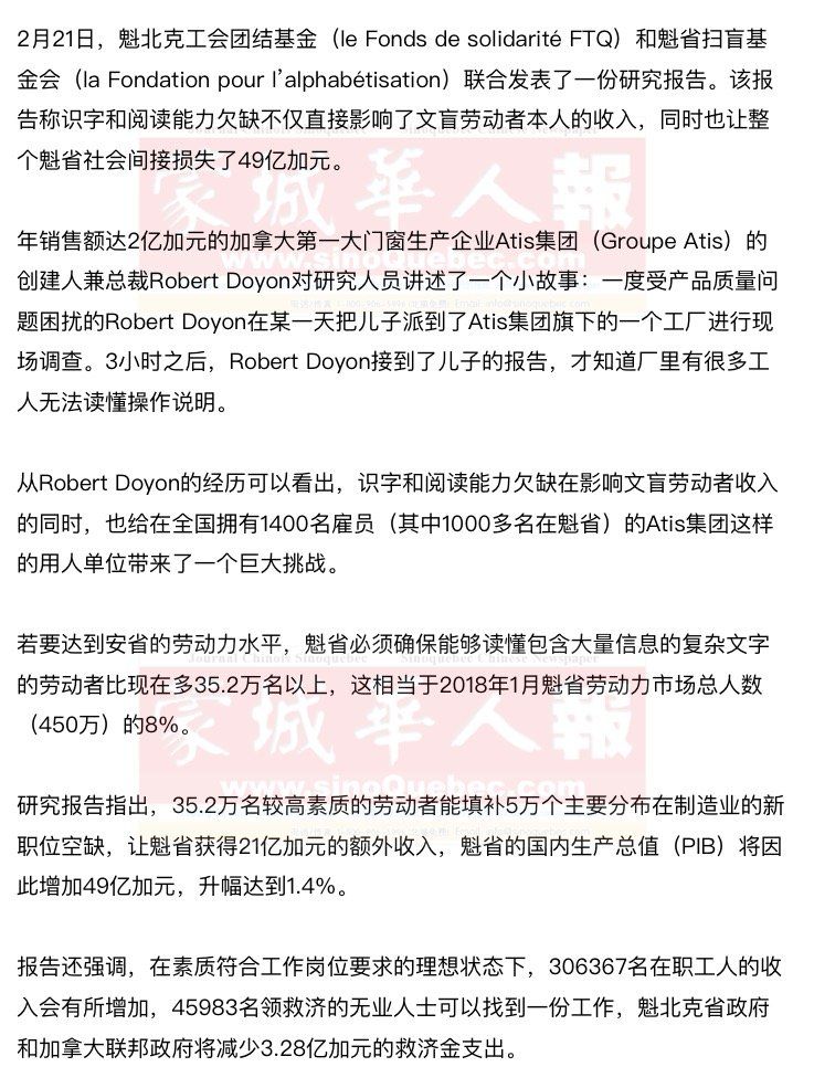 研究报告作者Pierre Langlois表示,劳动者的技能水平低于加拿大和经合组织(OCDE)成员国的平均线确实有损于个人和社会的利益。 Pierre Langlois还警告说,在本地招不到人的企业可能会考虑外迁,搬到一个能够为之提供合格劳动力的地方。 这位研究人员指出,青少年辍学和成年人技能陈旧过时是魁省文盲和半文盲多的主要原因。 魁省扫盲基金会主席André Huberdeau对此深感忧虑。他说在步入第四次工业革命之际,社会各界应该携起手来,努力提高现有劳动者和未来劳动者的基本技能,共同打造一个更加富裕的魁省。 |