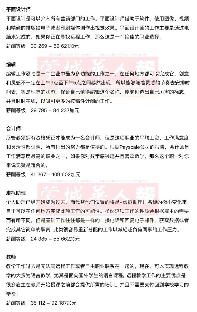 现在的求职者比任何时候都更愿意寻找远程工作或者是自由职业。另外,在线求职网站Workopolis上就有将近3000个职位是面向自由职业者的。 雇主们也开始考虑在工作时间和工作地点方面更加灵活,这样大大增进了员工们的幸福感。毕竟,在家工作拥有诸多好处。远程工作者表现得更为多产、压力更小,并且更加投入。同时,在家办公也是节省交通和午餐费用的好方法。 在家办公的主要优点是,能够在任何地方、使用合适的工具来完成日常工作。这显然不包括零售、服务行业或者其它所有需要人员在场的工作。 有哪些领域已经开始利用在家办公的优势了呢?下面就介绍6种职业能够让你从此实现远程工作、并且薪酬不错! 网络设计和开发人员 网络设计的工作包罗了众多职位,事实上,所有这些职位的工作都可以在家里完成。这些工作涉及技术架构、优化用户体验和网络整体维护。尽管这项职业需要一定的专业知识和专长,但是很多这个领域的专业人士都说他们是自学而成的。增加自己的技能、丰富自己的简历,然后就大胆出发吧! 薪酬等级:31 940 - 69 722加元 |