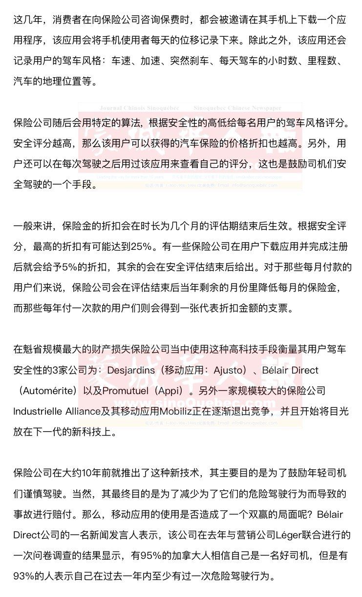 一项由Allstate Canada保险公司在2015年进行的调查的结果显示,有34%的加拿大人认为使用这种移动应用没有任何好处,而只有41%的人表示自己通过使用保险公司提供的移动应用获得了折扣。消费者以及支持这种应用的团体对于保险公司如何处理并保存收集来的个人信息保持警惕。保险公司方面则保证这些信息是完全保密的,而且不会被用来在续约的时候对保费进行调整。 虽然担心重重,加拿大人们似乎已经使用了这项新科技为他们的生活带来的改变。据《保险日报》(Journal de l’assurance)报道,Desjardins的移动应用Ajusto的用户当中有75%表示他们的驾驶行为有所改善,而91%的用户对其表示满意。 Desjardins公司为其顾客们提供的折扣的平均值大约为12%。去年11月,Intact Assurance公司(Bélair Direct的母公司)表示,该公司的移动应用的用户在过去3年来总共驾驶了38亿公里。 |