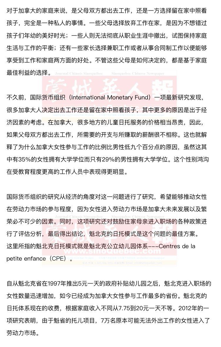 这是一道非常简单的 数学题。国际货币基金组织研究指出,魁省的边际效益,即双职工家庭的家庭收入在支付了托儿费用后真正的收入,远远高于加拿大其他省份和地区。与此作为对比的是,安省每年高达2.9万元的托儿费用,意味着如果父母双方都工作,则会出现更多的低收入家庭。在加拿大中产阶级中,日托服务份费用占据了父母一方(通常是母亲的)收入的三分之二。这种情况,在魁北克是不会出现的。 国际货币基金组织这项研究的作者们,从经济角度对魁省政府补贴的幼儿园项目进行了强有力的论证。他们认为魁省的政府补贴托儿系统不仅减小了劳动力市场的性别鸿沟,同时还使国民生产总值提升了4%。另外,受教育程度较高的女性参与职场,也对经济发展产生了巨大影响。 研究指出,目前大约有15万住家母亲拥有较高的教育背景。如果她们全部都进入劳动力市场并因此开始缴纳税收,那么就会把国民生产总值提升两个百分点,并因此增加80亿元的联邦所得税税收。在上一份预算中,联邦政府将在未来五年内投入70亿元用于创建4万个政府补贴的托儿位置。这些数字表明,加拿大政府在这方面可以并且应该做得更好。 考虑到魁省政府每年需要支付25亿元用于超过23万个Centres de la petite enfance政府补贴托儿位置,同时,为了弥补魁省没有足够CPE位置满足家长需求的问题,魁省政府还对那些送孩子们上私立幼儿园的家庭提供相当可观的减税优惠。对于那些受惠于魁省家庭友好的托儿政策的家长来说,国际货币基金组织的研究没有触及的另外一个问题是,对很多家庭来说,儿童日托并不仅仅关系到是否能够负担得起,还关系到是否能找到好的儿童日托。而魁北克公共资金支持的CPE,在对其所提供的服务质量的评估上,得分一直都是高于私立幼儿园的。对于很多家庭来说,托儿服务价格低廉诚然是一个很重要的方面,而接受良好的托儿服务也是一个至关重要的一方面。 每天早上,把孩子送到一个使他们能够在训练有素且薪酬得体的教育人员的爱心教导下接受良好教育启蒙的地方,对家长们来说是一件非常舒心的事情。自己的孩子能够在自己信任的日托中心健康茁壮成长,是家长们保持工作生活平衡的一个重要部分,同时也是一个家庭选择父母双方工作或者一方工作的重要因素。 当然,魁省的托儿项目无疑是需要上班的单亲家长的一个有力助手。另外,高质量低成本的早期托儿项目也大大改善了贫穷家庭的孩子的状况。因此,魁省的托儿项目可以说是双赢的一个项目。 这对于魁省和联邦政策决策者来说,是非常重要的,并且引人深思。魁北克不应该沉湎于昔日的辉煌,不应该躺在自己的功劳簿上固步自封,尤其是在目前失业率处于历史最低,并且在给“世代基金(Generations Fund)”大笔拨款之后仍有25亿元财政盈余的情况下。 扩展整个CPE系统,使得所有儿童都进入其中,为那些不是朝九晚五工作的家庭提供更大的机动性,应该成为政府下一步重点考虑的事情。归根到底,儿童是这个老龄化问题日趋严重的省份未来的工作者,为这些“年轻的”魁北克人提供一个在他们人生开端时的一个最好的可能性,是一个重要的经济目标。 |