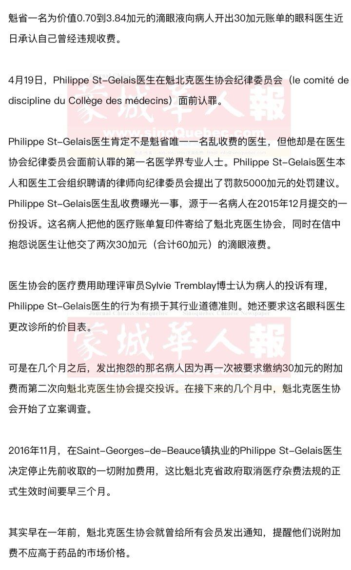 在受调查过程中,Philippe St-Gelais医生提供了给病人开出的20份滴眼液账单。应Sylvie Tremblay博士的要求,Philippe St-Gelais医生还列出了一个滴眼液实际费用(比他的收费低很多)清单。 Philippe St-Gelais医生的认错态度良好,对可能让他挨罚的调查也予以积极配合。但他的律师要求相关方面遵循医学理事会决议惯例,不要在当地报纸上发公告。 尽管Philippe St-Gelais医生是在医生协会纪律委员会面前承认违规收费的第一人,但他却不是遭纪律委员会调查盘问的唯一一人。2017年12月,魁北克市眼科中心(le Centre oculaire de Québec)的18名医生也曾出现在纪律委员会面前。不过这个案子现在悬而未决,医生律师团反对医疗费用评审员以滴眼液费用为证。此案已被转至魁北克高级法院。 |