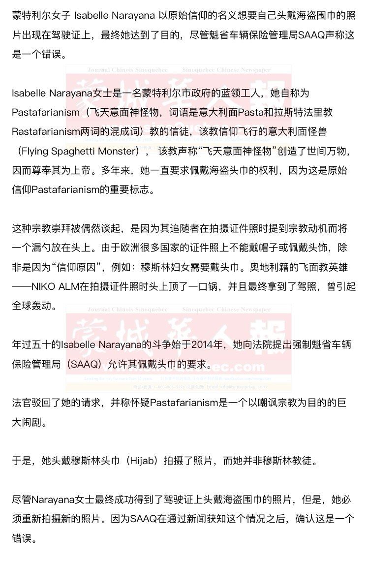 SAAQ发言人Mario Vaillancourt解释道,SAAQ的员工在人们提出仪容要求时通常相信人们是出于好的信仰,但有时候也有些怀有明显不好信仰的人浑水摸鱼。他补充说,SAAQ会给Narayana女士发送信件,要求她重新拍照;同时也会提醒员工在工作时严格遵守规则。 而Narayana女士方面,则肯定地说,Pastafarianism是一项真正的宗教,但它仍然鲜为人知,就像早期的基督教一样。 她还微笑着说,证明这是一个宗教的证据,就是它的信徒正在受到迫害。 |