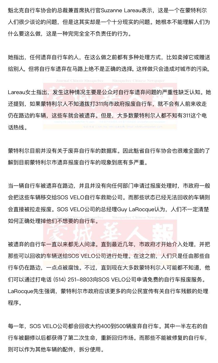 自行车行业组织要求蒙特利尔市民和市政府能够尽可能的处理好废旧自行车的问题。 尤其是当天气转暖,气温逐渐升高,那些被遗弃的自行车们开始在积雪中显露出来,让城市的整体形象大打折扣。生锈的链条,缺失的车轮,甚至没有了车把,只剩下一副车架子。这就是从去年入冬前一直被遗弃在户外的自行车熬过一个冬天以后的典型状态。 |