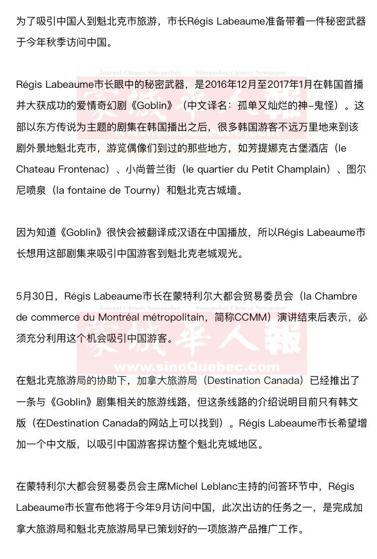 Régis Labeaume市长强调,自从《Goblin》剧组到魁北克市拍摄之后,该市接待的韩国游客数量迅猛增长。他在说到这个话题时,提到了非常有名的电视连续剧《Anne... la maison aux pignons verts》(中文译名:绿色屋顶之家的安妮)。在这部剧集完成拍摄多年之后,作为外景地的爱德华王子岛仍旧吸引着众多亚洲游客。 Régis Labeaume市长相信,《Goblin》剧集未来在中国的发行,肯定会让大批中国人萌发到魁北克走一走,看一看片中出现的那些美丽景点的愿望。 魁北克旅游局向媒体证实说,魁北克城的韩国游客从去年开始急剧增加,这些游客喜欢在le Theatre du Petit Champlain剧院附近的红色房门和芳提娜克古堡酒店的黄铜邮箱前面拍照留念。古堡酒店还特意为剧迷游客提供Goblin主题的住宿套餐。 魁北克旅游局的商务代表Kathy Leclerc说她几天前参加了加拿大旅游局面向韩国游客的旅游产品推介会,在会上得知韩国游客最想去的地方是魁北克城。 |