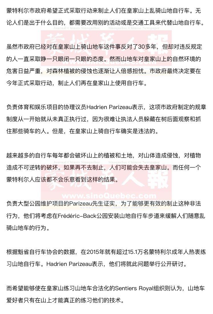 Sentiers Royal组织的发言人Gabriel Michaud表示,蒙特利尔目前并没有为山地自行车爱好处提供任何可以娱乐的基础设施,而北美许多城市都配有这样的设备。比如纽约,甚至多伦多。 蒙特利尔的山地车爱好者也想要在这里可以在政府的监督下合法的练习和使用山地自行车。山地车爱好者并不想以破坏植被和环境为代价来满足自己的兴趣。他们希望政府可以建造山地车小径,以确保人们可以在骑车的同时又不会擅自拓展路径,破坏周边的环境。 Michaud先生认为,山地自行车会伤害皇家山自然环境的观点存在着一定的偏见。这个论点并不是基于科学分析的基础上给出的客观评价。 在皇家山骑了7年山地自行车的Thomas Gehrig指出,这座山是蒙特利尔唯一一个可以让山地车爱好者放心前往又不用担心有机动车的地方。 Gehrig先生强调,人们在皇家山上骑山地车的目的并不是要去毁掉这座山,反而是因为他们喜欢这里,喜欢皇家山的环境。所以他们骑车的时候也会心存敬畏来保护这片土地。皇家山位于市中心,人们不需要开车,甚至不需要乘坐任何的公共交通工具就可以到达。而且这里没有门票,是一个人人都喜欢的独一无二的地方。这位年轻人还补充道,并非所有的自行车手都买得起骑车,并且有能力开车带着自行车离开城市到偏远的山地或是特殊的练习场地进行他们所喜爱的运动。 |