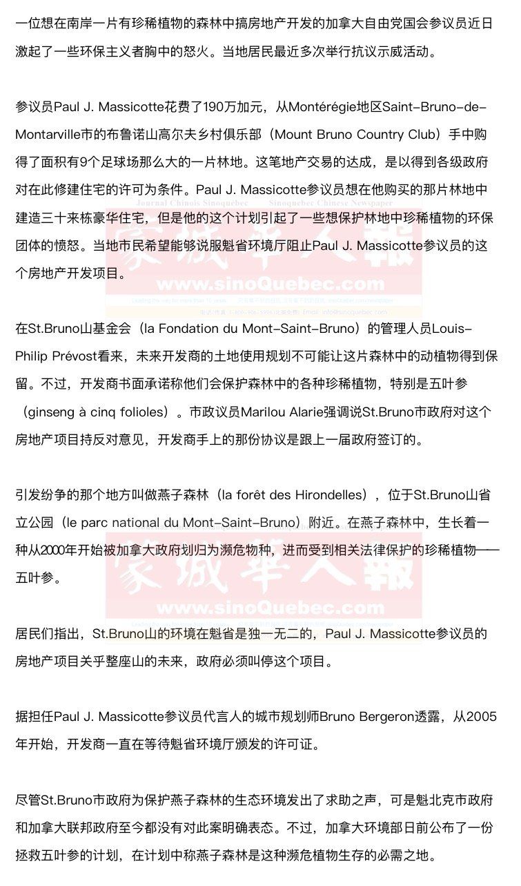 曾在加拿大环境部负责拯救濒危物种,现任加拿大自然与公园协会(la Société pour la nature et les parcs)总干事的生物学家Alain Branchaud认为,在燕子森林搞房地产开发的计划应该被阻止。 但开发商代表Bruno Bergeron还是觉得可以在保护五叶参的条件下修建住宅。Bruno Bergeron还强调说St.Bruno市政府(上一届市议会)已经跟开发商签订了合约,在合约中做出了修建公路和保留区的承诺。在他看来,不管有没有五叶参,市政府都应该遵守自己的承诺,如果开发商得到了魁省环境厅的许可,市政府就应该接受而不是唱反调。 2016年,魁省环境厅曾对一个将部分濒危植物移植到附近的St.Bruno山省立公园的方案表示赞同。 Alain Branchaud解释说,魁省环境厅厅长Isabelle Melancon有权忽略加拿大环境部的计划,特批燕子森林的房地产项目。St.Bruno市市长Martin Murray希望Isabelle Melancon厅长能够有所担当。他说保护环境需要一定的政治勇气,即便是得罪一些人也应该严格执法。 |