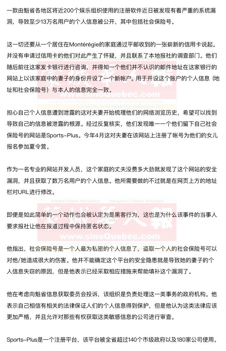 在成功修复了这个安全隐患之后,Sport-Plus开始联系其用户,希望得知他们的个人信息是否被他人窃取。 Sport-Plus的负责人Robert Martin表示对于其系统的弱点已经有所了解,并且表示这是由于2个月前的一次软件升级造成的。但是他的队伍等待了几个礼拜才开始对漏洞进行修复,因为他们想“抓住作案人员”。 Robert Martin确认一些用户的个人信息因为这个系统漏洞而被他人获取。但他同时也表示,只有一小部分的用户在注册时被要求提供社会保险号。 该公司目前正在检查全部的站点日志,但是Robert Martin表示初步评估并没有发现任何异常流量。 |