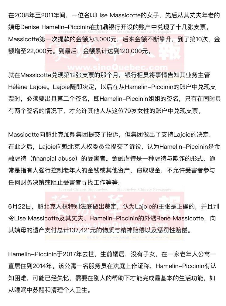 Massicotte夫妇没有出席特别法庭的听证会,只是告知法庭他们没有剥削Hamelin-Piccinin,这些支票都是他们的姨妈同意借给Lise Massicotte的。这对夫妇于2012年9月申请破产。 人权委员会表示,这对夫妇侵犯了Hamelin-Piccinin免于遭受任何形式剥削的权利。法官Ann-Marie Jones在裁决中写道,这对夫妇对脆弱的受害人进行剥削,以谋求个人利益。 |