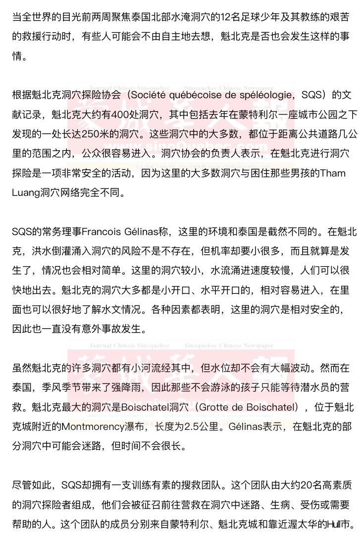 目前,SQS正在想方设法获得一种可以搭载相关设备的车辆,并且随时做好准备,一旦有洞穴紧急情况发生,在得到通知后可以立即出发。Gélinas说,虽然魁北克一直没有洞穴紧急情况发生,但是在1999年,SQS的洞穴救援团队却曾经被征召前往墨西哥,营救一名坠入洞穴的魁北克女子,这名女子受伤被困6天,但救援行动最终获得了成功。 洞穴探险协会还在一些较大的洞穴所在市镇,培训消防人员如何进行洞穴救援。Gélinas表示,通常,非洞穴探险人员不具备进行地下救援的资格,这是因为他们不了解环境也不具备相关技术。 Gélinas说,他和他的同事们对泰国的救援工作都非常关注。这个事件给他们带来了很多大的触动。当人们进入洞穴时,总是会考虑到遭洪水淹没的风险,尤其是在外国探险的时候,可能会比在魁北克时想得更多。很显然,发生事故的可能性是一定会存在的,这是由于环境的潜在危险而造成的,幸运的是,这种情况在魁北克并不常见,但这并不意味着在这里就可以高枕无忧了,相反,人们应该时刻牢记这种风险,因为在泰国发生的实在是一个令人揪心的故事。 |