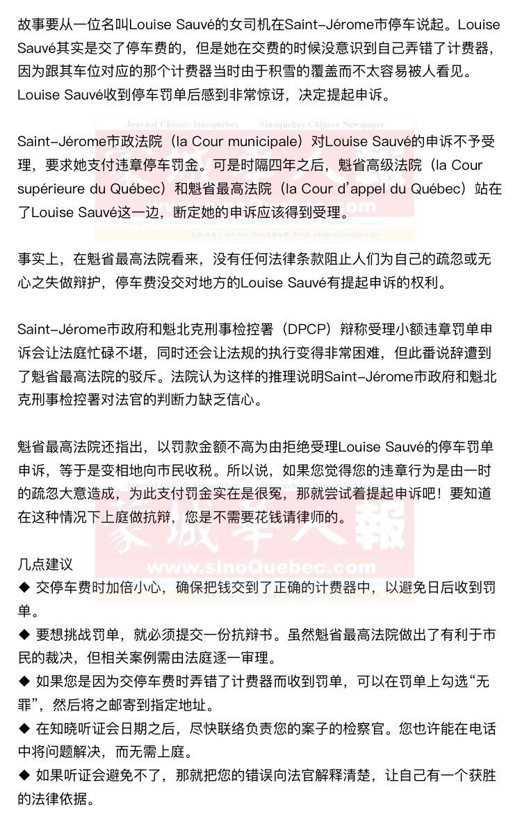 很长时间以来,魁省居民因为在路边停车缴费时弄错计费器而收到罚单几乎是不可能提出异议的。不管是出于何种原因的违章停车,基本上都被视作不可为之辩解的违规行为。一旦执法人员掌握了违章停泊车辆的证据,当事人就只能承认有罪,而无法做出任何抗辩。然而,魁省最高法院日前发出的一份裁决似乎正让这个现状发生改变。 |