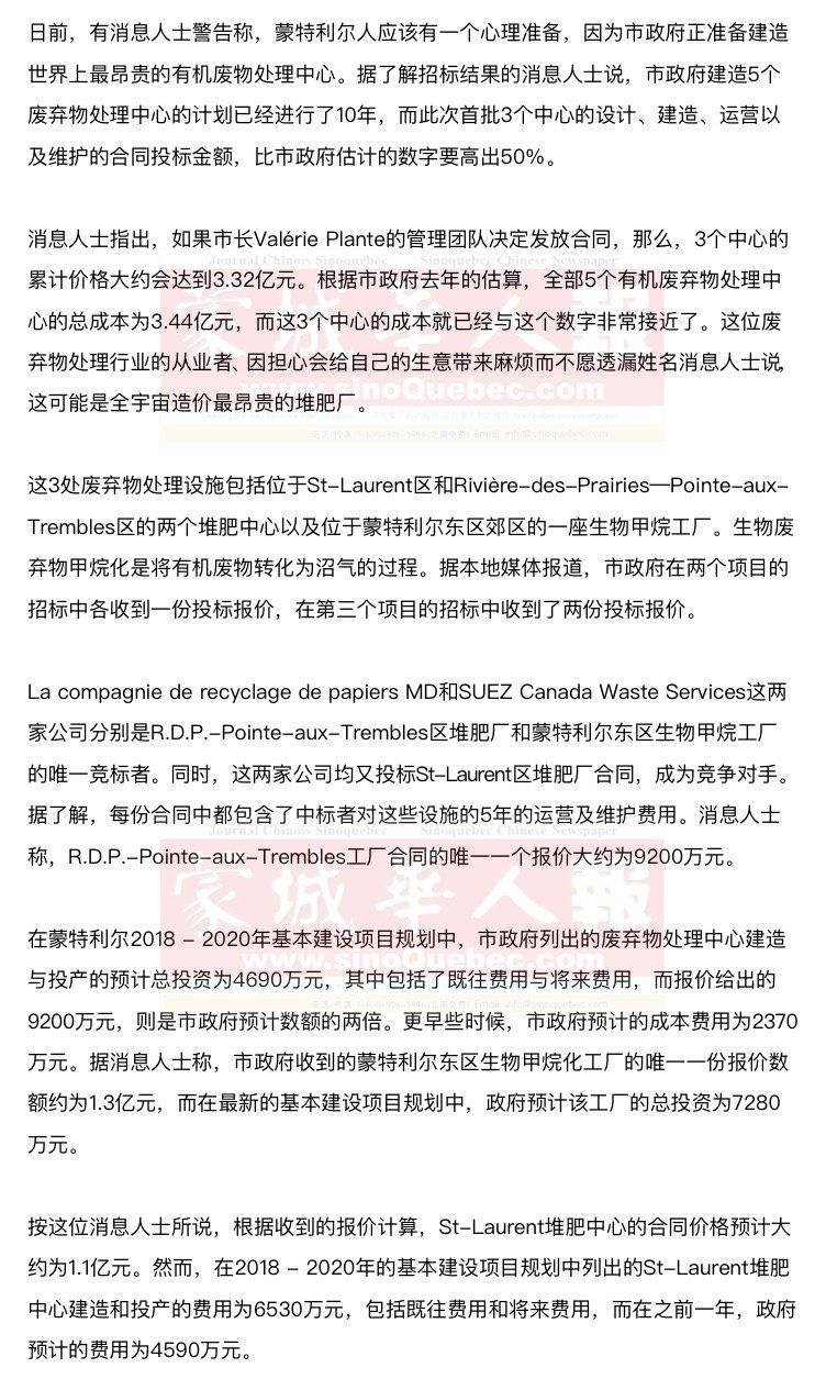蒙特利尔市政府拒绝讨论投标价格,一位发言人表示,在招标过程的目前阶段,这些价格都是保密的。之前,媒体已经就堆肥中心项目的问题,多次向市政管理层提出了采访要求,但市长办公室没有任何回复,而与此同时,有关投标价格远超标的价格的消息却被过滤掉了。 环境顾问与废弃物处理专家Jean-Louis Chamard为4家行业公司工作,这些公司均对政府在St-Laurent区选址建造堆肥厂的决定持反对意见。Chamard说,他估计市长Plante的管理团队将不得不依靠增加税收的办法来解决这些堆肥厂的资金问题。 Chamard的客户是St-Laurent堆肥厂所在社区的成员,他们都对因垃圾车出入而造成的交通量增加感到担心。他说,他不相信因为税收增加,市民就会有兴趣或自觉地将垃圾分类,然后把它们放进堆肥垃圾桶。可能有些人会这样做,但大多数人是不会的。 Chamard表示,他已从在市政府工作的一个联系人那里得知,合同投标价格非常之高,市政官员们现在必须要做出决定,是否继续发放合同。他说,从市政府在招标中提出的要求和各项参数来看,很明显,成本费用还会更高。 Veolia是一家全球性的跨国公司,仅在北美地区就运营着100多座废弃物处理设施。该公司在8月上旬的时候表示,集团管理层已经做出决定,不参与蒙特利尔有机废弃物处理工厂的合同竞标,因为有关技术、管理和财务的整套条款都不符合集团公司的要求。 2013年,蒙特利尔时任市长Michael Applebaum领导的市政管理团队通过了一项贷款1.7亿元的次级法规,用以解决5个废弃物处理中心中的4个中心的费用。当时的总价估计为2.375亿元,其中应该包括为这些堆肥中心征地和治理污染的费用。 当时,Applebaum的市政管理团队批准了St-Laurent区堆肥工厂的选址,将工厂地址设定在Henri-Bourassa大街9091-9191号。最终,市政府以1846万元的费用征用了这块土地。不过,该场地是堆肥中心所需面积的两倍,因此,市政府不得不支付场地上现有建筑的拆除费用以及污染治理的费用。 一年多前,在时任市长Denis Coderre执政的时候,市政府启动了3处废弃物处理设施的公开招标工作。但是,3个项目的投标截止日期被推迟了多次,因此一直到今年标书封袋才被启封。 2016年的时候,Coderre表示,5处废弃物处理设施的成本已上涨至2.88亿元。一年之后,也就是在2017年,Coderre又披露说5处设施的整体价格标签已经达到了3.44亿元。当时,Coderre领导的市政府表示,这笔费用中的1.356亿元资金将会由省和联邦政府拨款。 |
