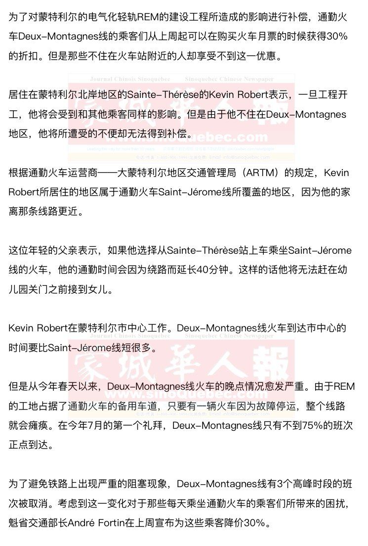 Lisa-Marie Legault同样也无权获得折扣,因为她的家也不在Deux-Montagnes路线的涵盖范围内。但是,Deux-Montagnes线却是离她家最近的一条通勤火车线路。 居住在Mirabel、在Sainte-Justine儿童医院工作的Lisa-Marie Legault质问道,如果她无法获得折扣,却又不得不忍受不断晚点甚至取消的火车服务,那么她为什么还要乘坐火车呢? ARTM的新闻发言人Simon Charbonneau通过邮件解释说,通过利用覆盖区域这种方法来决定有权获得折扣的乘客这种方式,ARTM可以让93%受影响的乘客有权购买到低价车票。至于那些无法获得折扣但是相信自己有权得到赔偿的乘客,ARTM邀请他们联系Exo的客服部门。Simon Charbonneau解释说,这种筛选方式是为了防止欺诈行为以及防止成本超支。 30%的月票票价折扣将会持续到2019年底。在此之后,Deux-Montagnes线的中央车站到Du Ruisseau站的路段将会被关闭。ARTM表示,届时将会有其他措施来帮助乘客们度过这段非常时期。 |