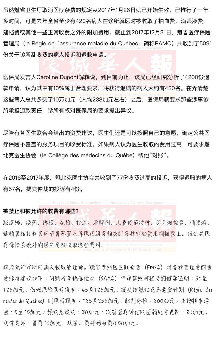 诊所收取医疗杂费是被魁省政府明令禁止的,但要求病人为公共医疗保险不覆盖的服务项目缴纳管理费却是合法的。 据魁省眼科医生协会主席Come Fortin博士透露,眼科医生们必须退回的检查费用介乎于150至200加元之间。某些不服医保局决定的眼科医生可能会向法庭申诉,请法官对那些术前检查的必要性进行仲裁。 魁省全科医生联合会(la Fédération des médecins omnipraticiens du Québec)认为目前没有任何数据表明医生们在更频繁地收取管理费。 在Stéphane Defoy看来,管理费应该跟医疗杂费一样被取消。他还说诊所收取管理费是捍卫医生利益的医生联合会建议的,如果这些已成为“民众就医障碍”的费用不被政府叫停,那么就应该为公共医疗保险所覆盖。 魁省全科医生联合会发言人Jean-Pierre Dion称医生已经是最受规管的职业之一,医生有权像牙医、验光师和心理治疗师那样,自行确定公共医疗保险不覆盖的服务项目的收费标准。 今年1月,在某些眼科诊所因非法收费被要求赔偿之后,魁省眼科医生协会(Association des médecins ophtalmologistes du Québec)主动联络了魁省医疗保险管理局,以确定眼科医生的费用收取范围。对眼科医生的乱收费投诉涉及到一些白内障手术的自费术前检查,魁省医保局认为这些检查没有必要。患者摘除白内障后,佩戴矫正视力的专用隐形眼镜前做的配镜评估不在此列。 |