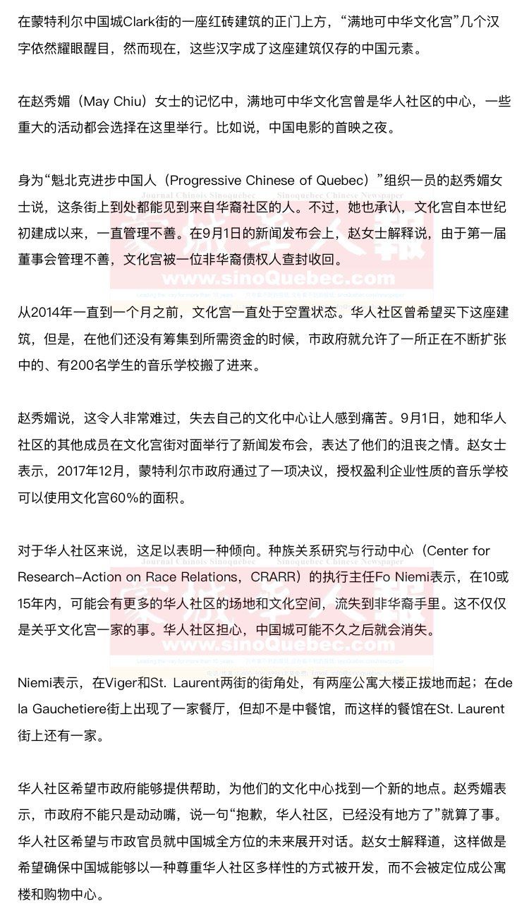 文化宫内之前存放的一些文化物品和工艺品的命运,也引起了人们的关注,其中包括数千册图书以及孔子塑像等等。入驻满地可文化宫的音乐学院的老板Luc Lafontaine对媒体表示,他一直在尽力将这些物品归还给华人社区的成员。 Lafontaine说,有数千册图书被送到了魁北克国家图书馆(BAnQ),其他物品也送交给了文化宫前任主管Pierrette Wong。他表示,他曾经向植物园提议,将孔子塑像送到他们那里,但是这个提议被对方拒绝了。现在,塑像依然保存在文化宫内。 蒙特利尔市政府在一份声明中表示,如果华人社区有人能够买下这座建筑,那么文化宫本来也是可以归还华人社区的。但这种情况并没有出现,因此,市议会经过讨论和投票表决,通过了另外一种解决方案。 Ville-Marie区的市议员Robery Beaudry解释说,市政府与音乐学校达成了协议,可以使华人社区成员在一年中的某些日子里进入中心。他说,市政府希望与华人社区合作,以维护蒙特利尔中国城的社会组合。 |