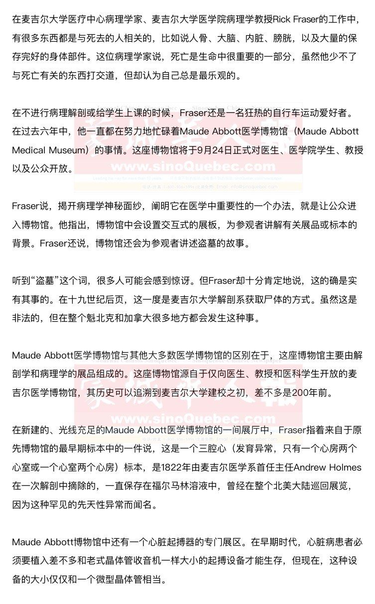 在1876到1884年间,包括William Osler爵士在内的一大批声誉卓著的医生和教师,向原先的博物馆捐赠了数百件的标本。不过,现在大多数人都认为,Maude Abbott才是这座博物馆背后的驱动力,因此,校方决定以她的名字来命名这座博物馆。 Maude Abbott是十九世纪八十年代的麦吉尔大学文科毕业生,她在申请进入麦吉尔大学医学院就读被拒绝后,最终获得的了Bishop’s大学的学位。然而,在1898年,她被任命为博物馆馆长,并且在这个职位上工作了25年。 Fraser指出,Abbott是使这座博物馆发展成为教学博物馆的重要人物之一,在她的领导下,博物馆变得有活力了。但在她离开后,博物馆在医学教学中的重要性开始降低,以至于到了20世纪末,从原博物馆收集的数百个标本都被塞进了一个老旧的地下室,没有人照看。因此,在在很大程度上讲,Fraser是凭一己之力把这些标本带进Maude Abbott博物馆的。他说,他的目标是能够挽救全部的标本材料。在过去,有很多东西都被丢进了垃圾箱,现在博物馆里的很多东西,都是他从垃圾堆里抢救出来的。但是,不论在什么时代,什么情况下,有一样展品是永远不会被丢弃的,它是一位年轻女子的骨骼,其历史可以追溯到5000多年前,可能是博物馆里最古老的藏品。 Maude Abbott医学博物馆地址是University大街3640号,Strathcona解剖与口腔教学楼。博物馆为免费入场,如需了解开放日程的相关信息,查询网站:mcgill.ca/medicalmuseum。 |