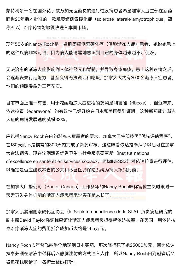 不管费用如何,依达拉奉终究是让Nancy Roch看到了生的希望。算上一位朋友去年冬季从日本给她带回来的价值20000加元的另一批依达拉奉,Nancy Roch已经为治疗渐冻人症投入了5万多加元。她说随着时间的推移,手上的积蓄就像阳光下的雪球一样迅速消失。 2017年3月诊断出渐冻人症的Nancy Roch现在已无法活动她的左手。就在前不久,她感觉到右手开始失去知觉。不过,Nancy Roch已经停止使用依达拉奉,因为她现正自费参加一个美国的干细胞临床试验。Nancy Roch说她这是在冒险,因为仅有一半的试验参与者能得到治疗,另一半参与者得到的只是安慰剂。但是对面临死亡威胁的Nancy Roch而言,这样的试验还是值得参加的。 |