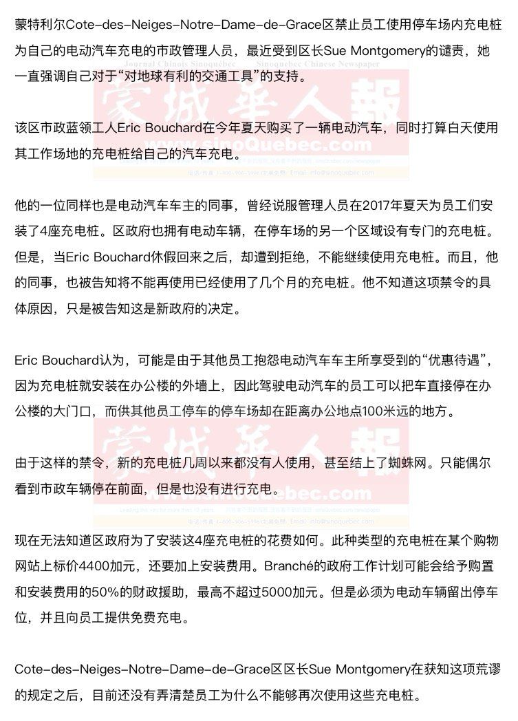 但是她已经要求管理人员找到办法令员工能够使用。她说,禁令是一种没脑子的做法。我们应该鼓励电动汽车。就像她希望所有的设施都装有自行车架,以鼓励员工骑车上班的做法是一样。 另外,区长还说,她已经放弃区政府办公室为她预留的停车位,改为安装能够停放14辆自行车的车架。她说,她没有汽车,打算骑车上班,而且自行车架很受欢迎,甚至供不应求,有时候她来上班的时候都没有地方停放自己的自行车! Eric Bouchard希望区长的干预能够让他今后可以继续使用充电桩。他家住在距离工作地点75公里的地方,现在他的车充满电后的续航能力可以支持上下班往返,但是当天气很冷时,电池的电量将会下降得更快。如果今年冬天,温度降到零下20度;如果他还是不能够在上班地点充电,那么他就不得不借用自己母亲的汽油汽车来上班了。 |