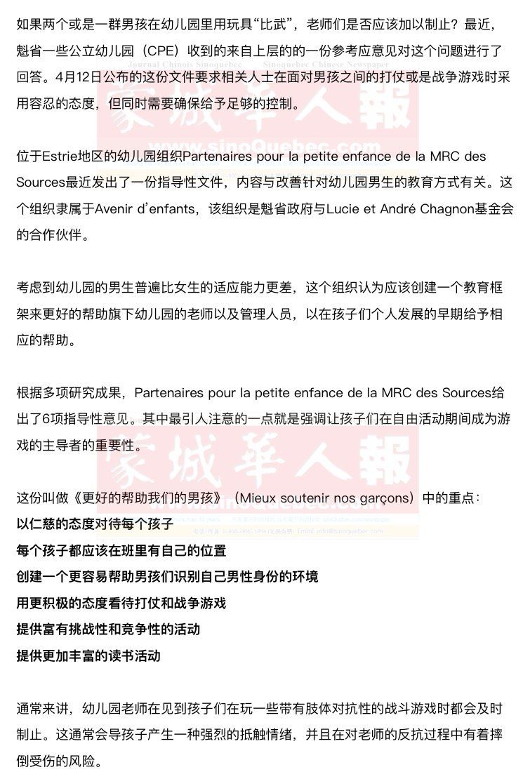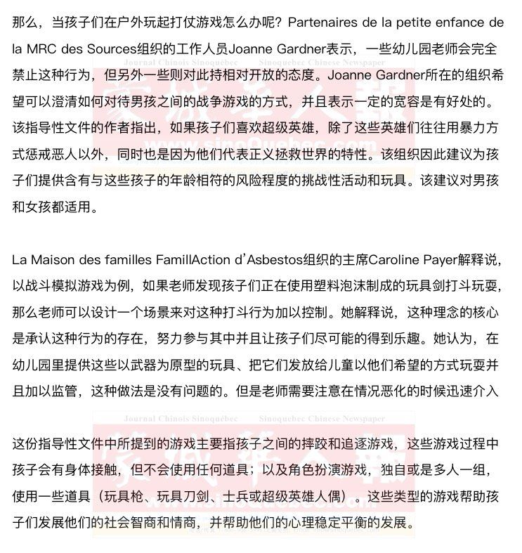 蒙特利尔大学早教专业的教授Daniel Paquette对于这份指导性文件的反应是:终于有人站出来说句公道话了。Daniel Paquette针对幼儿之间的战争游戏进行研究已经有大约15年的花四溅了。 Daniel Paquette认为,他的研究结果表明,制止这类游戏所带来的损害要超过所带来的好处他表示,这是帮助孩子们为成人生活做准备的一种方式。男孩天性热爱竞争,他们通过这类游戏可以学到很多东西,这些游戏满足了他们的一些 天然的需求。他认为,只要游戏没有发展成为战争的打斗,老师应该给予一定的容忍。 Daniel Paquette还指出,这类游戏并不是男孩的专利,实际上不少女孩也喜欢具有战斗性质的游戏。他认为,这些游戏百利而无一害,其根本目的是通过更加多样性的活动来帮助孩子们为接下来的生活做好准备。 |