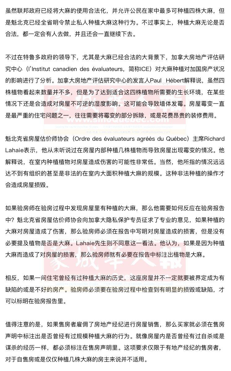 建议 房屋保险合同并没有明确的规定是否要声明在房屋内有种植大麻的活动。所以房主没有必要向保险公司说明自己种植大麻的意图和行为。 但是,民法规定,被保险人必须向其所在的保险公司提交任何可能会影响保险公司评估房屋风险的信息。所以如果您的住宅或房产拥有大规模的大麻种植行为,无论您是房产的租赁方还是所有方,您的保险公司将有权了解这一情况(部分保险公司会指派调查员前往检查)。 根据魁北克省的新法,房主可以和房客重新签订租赁合同,并在合同中标注出是否同意租房者在房屋内使用大麻。 如果住户(租户)在房屋内种植或者使用大麻,业主通常需要通知他们的保险公司。根据最近的判决,如果业主未能通知保险公司,则业主承担未提交相关信息的责任。 如果因为使用大麻或种植大麻而发生火灾,保险公司有理由拒绝向屋主提供赔偿。 |