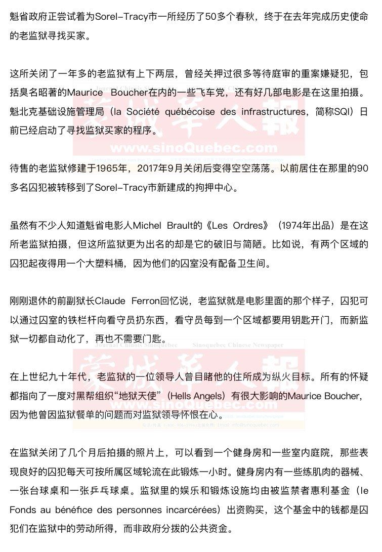 目前无法知晓魁北克基础设施管理局对这所老监狱的要价,因为此项信息只会透露给潜在买家。 按照魁北克基础设施管理局的估测,老监狱的地面建筑价值94.9万加元,30544平方米的土地价值47.65万加元,所以监狱的总价值约为142.5万加元。 Sorel-Tracy市市长Serge Péloquin指出,购买老监狱的实际成本很可能会远远高于上述金额,因为买下来后必须对它进行大规模的去污处理,去除地板、墙面上的含铅涂料和墙壁中的石棉。 |