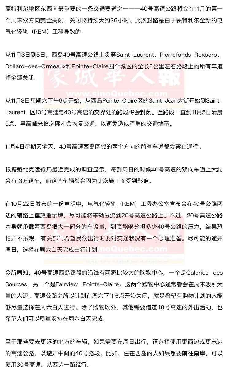 除此以外,发言人Lacroix先生建议大家尽可能通过Saint-Jean大街绕行至20号高速公路或是13号高速上。他们会从Vaudreuil-Dorion开始摆放汽车分流的警示牌,以便告诉上岛的车辆如何尽快进入20号高速公路。 Lacroix先生表示,项目办公室已经和魁北克省可持续交通与电气化交通运输局以及其他的相关合作伙伴一同努力了数月,希望可以尽可能的保证高速公路关闭的这个周末不会影响居民的生活和出行质量。此外,交通部也保证,会在很远的路段就开始安置警示牌,提醒人们40号公路已经关闭,并引导他们尽早前往分流车道。 据电气化轻轨(REM)工程办公室发言人表示,由于要拆除13号高速以西跨越40号高速上的一条旧铁路桥,他们必须要对40号高速进行封路关闭。而拆除旧的CN铁路桥对整个轻轨工程也是必不可少的一环,因为未来的轻轨列车还要使用这个空间。整个拆除工程预计耗资64亿加元。Lacroix先生解释说,这是一座不再符合业界标准的古董桥梁,如果保留并修护它,恐怕只会花费更高。不过,拆除之后,轻轨工程将利用这个空间建造更为复杂的交通系统。除了要架起允许轻轨在高速公路上方驰骋的桥梁之外,该项目还计划在这里修建出西岛轻轨线路和特鲁多机场列车的交叉站点。 |