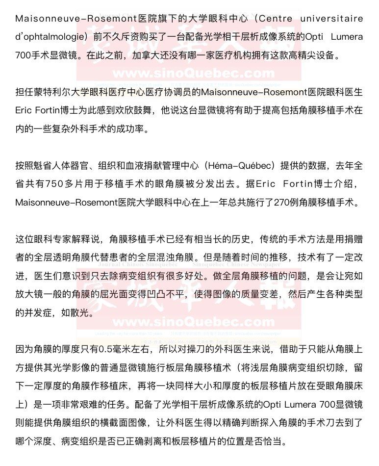 在Eric Fortin博士看来,Opti Lumera 700显微镜对技术失败率较高的深前板层角膜移植手术(DALK)会特别有用,将有效降低此类手术中角膜穿孔的风险。另外,这款新型显微镜对后弹力层角膜内皮移植也会有很大帮助,它能让医生顺利地完成手术中最关键的一个步骤——放置移植片。 Eric Fortin博士称,Maisonneuve-Rosemont医院大学眼科中心使用Opti Lumera 700显微镜已经有一个月时间,用过它的医生都对它给予强烈好评。这台设备今后的使用率应该会很高,因为它不仅可提高角膜移植手术的成功率,还可让视网膜手术和青光眼手术变得更加安全。 |