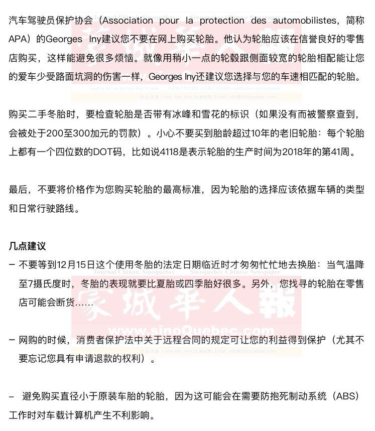 多人可能还沉迷在金秋的温暖舒爽中,但携带着狂风暴雪的寒冬离我们却并不遥远。如果您想从容地避开十二月上、中旬的购、换胎高峰期,那么现在就得开始选购冬胎了。 以下这个故事可能对您有启发。今年五月底,一位魁北克人到一家轮胎零售店,请人将他的冬季车胎换成了夏胎。六月中旬,因为汽车出了一点小毛病,他又找人来修车,结果汽修师告诉他他的车胎不能再使用了。珍爱生命的这位魁北克人不得不紧急购买了四个夏胎。去买新胎的时候,他就在琢磨为什么那家帮他换轮胎的店铺会把不能再用的夏胎直接装上去,同时又后悔自己先前没有太留意车胎的磨损度。 过了没多久,一个朋友坦言他也有这样的经历,不过他的问题出在冬胎上。如果您的车胎已经用了很长时间,那么一定要经常检查其磨损度。怎样检查呢?您可以将一枚带有鹿头图案的25分硬币头朝下插入胎面沟槽中,如果鹿嘴露出来了,就说明轮胎的厚度低于6/32英寸的安全标准,是时候购买新轮胎了。 另一个朋友去年十二月份请车行的人把他的夏胎换成了冬胎。今天二月,这位朋友发现他那使用了两年的冬胎磨损得特别厉害。定睛一看,他才发现车上装的不是自己的轮胎!因为装错轮胎的情况时有发生,所以在这里有必要提醒大家:如果是请别人代为保管自己的轮胎,一定要准备一份标有细节的文件,再拍几张照片留存。 - 上网查阅汽车驾驶员保护协会的轮胎分类:bit.ly/2y8tJOq(10月10日更新)。 - 相关阅读:bit.ly/2DQmWis(汽车驾驶员保护协会网站)和 bit.ly/2y8o8rl(魁省车辆保险局网站)。 - 想申请冬胎豁免证书的“雪鸟”可在bit.ly/2grmcFK上查询相关信息。 |