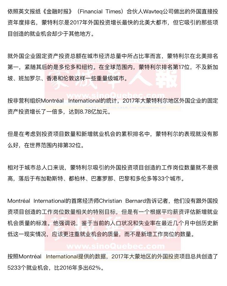 2017年大蒙地区排名前五的外国投资 1. 瑞典宜家(IKEA)公司(在Beauharnois市开设了一个配送中心):1.6亿加元 2. 德国西门子(Siemens)公司(在Dorval市开设了一个燃气轮机厂):1.33亿加元 3. 英国双重否定(Double Negative)公司(在蒙特利尔市开设了一个视觉特效工作室):投资金额不详 4. 意大利德玛(Delmar)公司(在蒙特利尔市Lachine区开设了一个制药厂):0.45亿加元 5. 法国布里多尔(Bridor)公司(在Boucherville市开设了一个面包厂):0.4亿加元 |