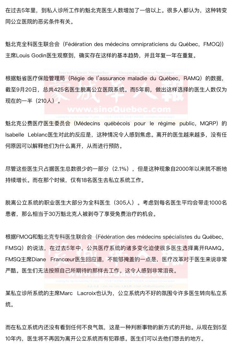 而医生工会方面,则保持希望,创造更好的条件来说服医生们回归公立系统。 魁省前卫生部长Gaétan Barrette上台后推出的医疗和社会服务法(20号法案)的一个条款指出,如果医生没有达到一定的会诊患者指标,将面临被扣除30%薪金的罚款。 一些专家认为,20号医疗法案迫使更多的魁省医生选择转行,医学院中途退出的学生也增长迅速。而Gaétan Barrette在结束四年任期后,也没有完成85%魁北克人拥有家庭医生的承诺,新任卫生部长将如何改善魁北克人看病难的问题还是未知数。 |