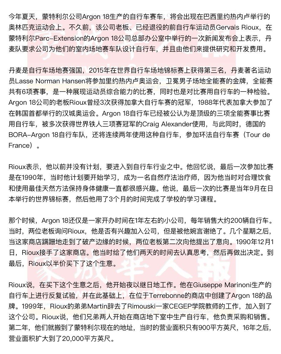 Rioux表示,他有一步一步地打造公司的耐心。他们在Chicoutimi有一家公司,为他们生产自行车。但后来,碳纤维材料出现了,Rioux开始有了生产碳纤维自行车的想法,因此,他到了亚洲并找到了一家工厂。 Rioux说,从1999年起,他们的生意每年都能增长20%,他主要进行产品的研究和开发、市场开拓,以及与供应商打交道,他的弟弟则负责销售和管理。他们有不少员工负责组装自行车,现在已有43名雇员,产品出口到74个国家。Argon 18公司每年销售超过15,000辆的自行车,他们的产品的价格范围从1,800元的基本型公路自行车,到15,000元的顶级的三项全能自行车,应有尽有。 当Rioux还是16岁的时候,就开始在一家自行车商店工作,他的父亲是一名水管工,而Rioux也喜欢在地下室中搞一些小发明创造。他喜欢自行车上的那些装备。后来,当他参加比赛的时候,他一直问Marinoni,是不是可以改动一下某个零件的角度,或是可以找到其他的办法,让自行车的效率更高。这种想法和愿望,后来融入到了Rioux所说的“最佳自行车”的研究工作中。 Rioux解释说,他们试着去找到自行车在几何构造、整体刚性以及平衡上的正确组合,碳纤维自行车非常轻,必须要改变几何构造,使它能有更好的操控性。Rioux说,因为自己是一个自行车运动员,他懂得舒适的重要性,而且他们设计的自行车赛车,骑车者能够调整车把和车座,更容易骑行。 Rioux表示,Argon 18永远不可能大到能与著名品牌Trek或Cannondale匹敌。Rioux说,他们有数以十亿元计的资金和几百种型号的产品,Argon 18的规模可能永远也达不到那样,也不想成为那样。Argon 18专注的是公路赛车、场地赛车以及三项全能赛车,正在为制造最好的自行车而努力工作。 |