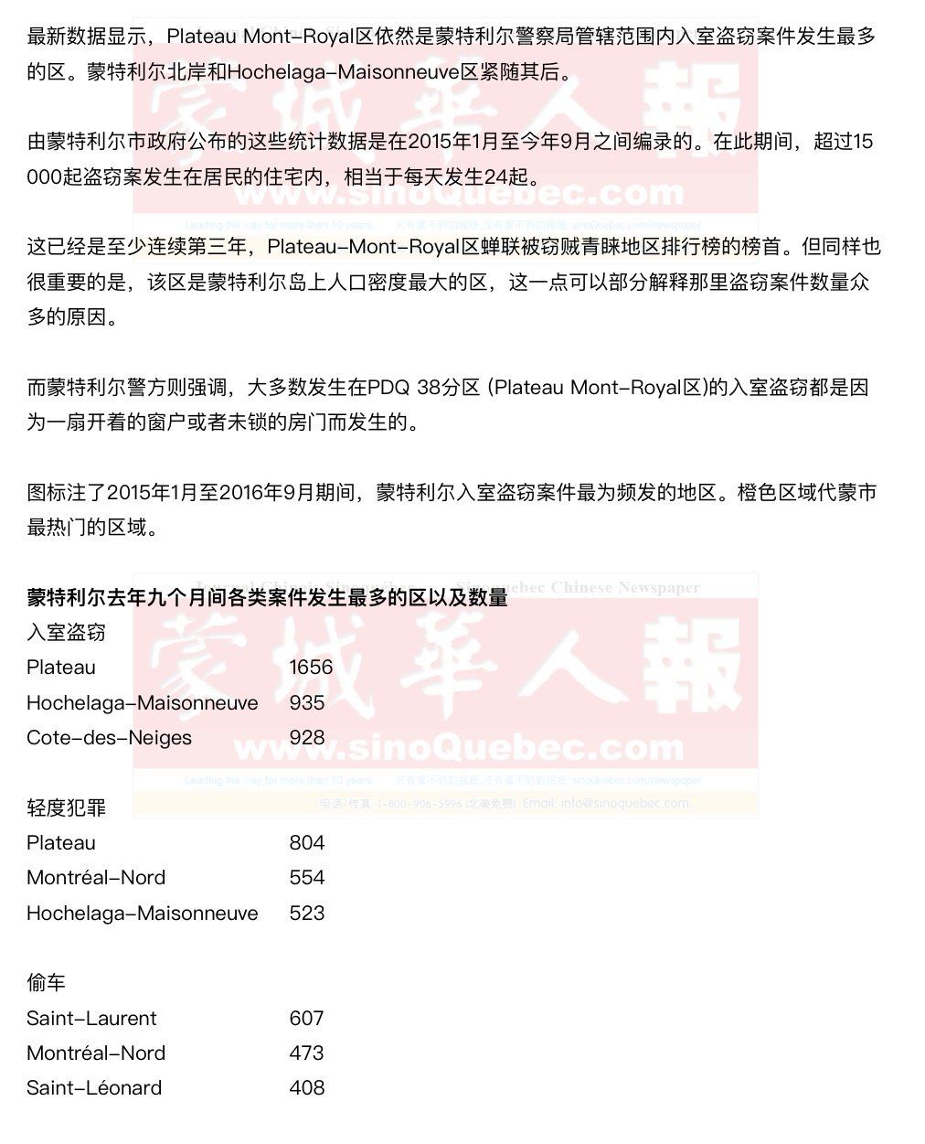 警察方指出,为了帮助警方同盗窃严重的问题进行斗争,受害人报案很重要,并且如果受害人提供的证据有关嫌疑人的信息尽可能详尽,警方就能尽快投入调查。警方最近刚刚抓获一名嫌犯,他涉嫌同Plateau区数起入室盗窃案有关。 地产经纪公司负责人Nathalie Clément从30年前就在Plateau区做房产经纪,她从未遇到由于担忧此类案件而避免在该区买房的客户。她认为,虽然客户对此类案件最为敏感,但是,这并没有阻止他们来这里落户。但同时她也观察到,越来越多的客户安装了报警系统。 保险业从业人员Pierre Duchesne解释道,保险公司在某个特定区域收到的索赔数量可以对该区域客户家庭保险的保费额度带来影响。但是,失窃险的理赔金额通常在2500加元或者3000加元,并不是像管道漏水那样能使理赔金额高达5万加元的大问题。因此,如果某个区域盗窃案频发,对保费的影响不会太大。 |