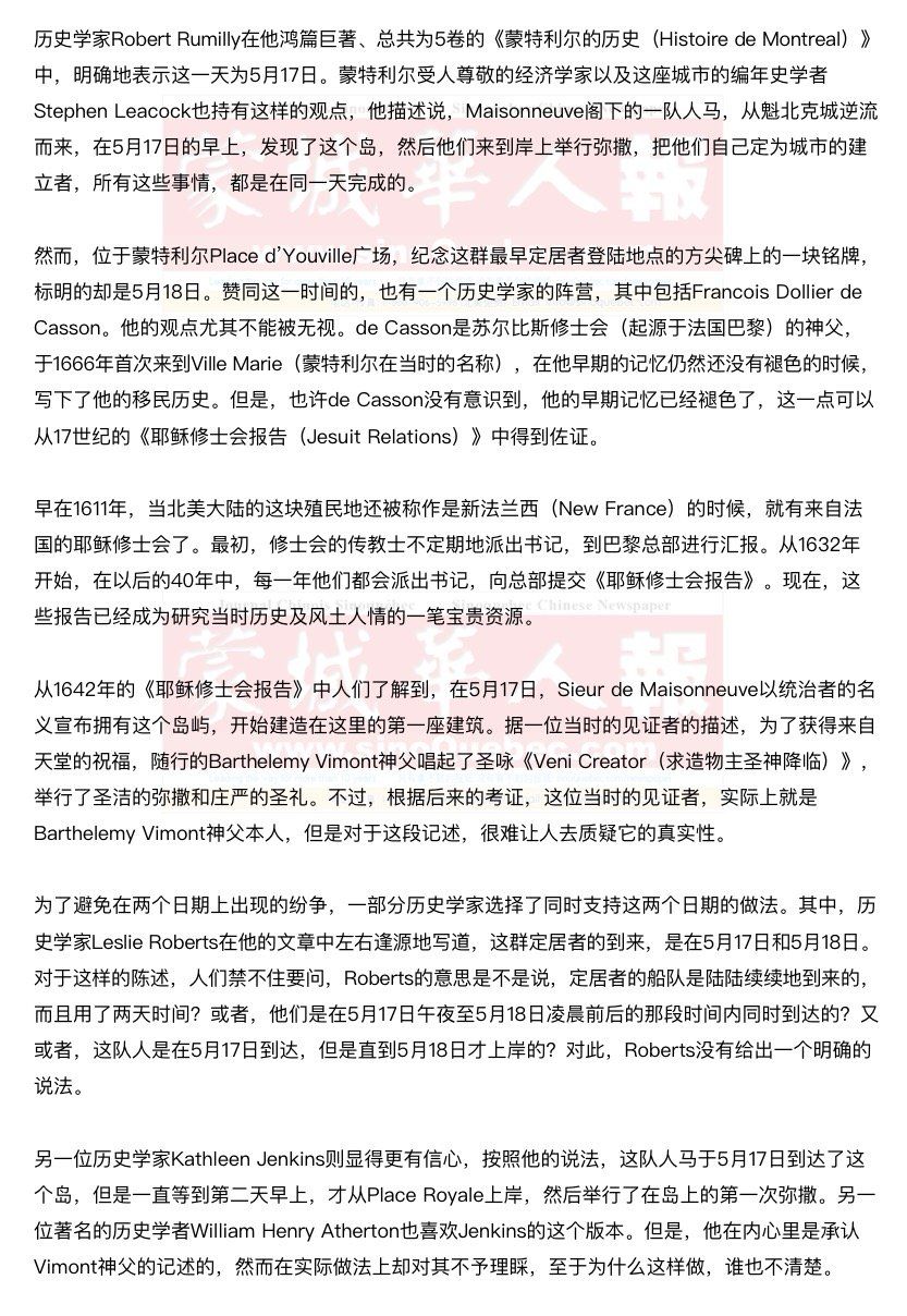 本周,蒙特利尔到处都在举行庆祝活动,纪念375年前的一个史诗般的日子---1642年5月的一天,Paul de Chomedey, Sieur de Maisonneuve(梅森诺夫爵士,保罗·德·楚梅迪)和他的50余名追随者,建立了蒙特利尔。对于这一天,有人说是在1642年5月17日,也有人说是在5月18日,但到底是在哪一天,现在似乎没有人能够给出一个肯定的答案了。 |